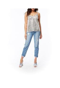 Lost and Wander Shimmy Shimmy Cami-Super cute cami to dress up any outfit. This top is silver and shiny with adjustable straps.  Pairs nicley with a pair of black wax jeans and silver strappy heels. Silver is the way to...
