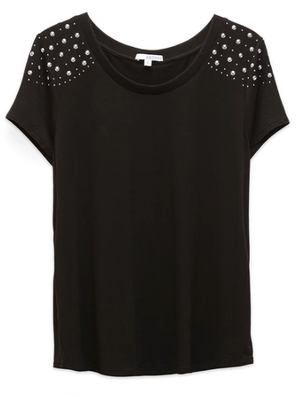 Soft stylish top with silver studs on the sleeve This top is great with skinny jeans and black boots 95% Rayon 5% Spandex