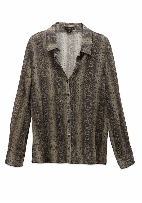 100% ViscoseĀ  This blouse has a snake skin print easy to pair with a black skirt or pants!