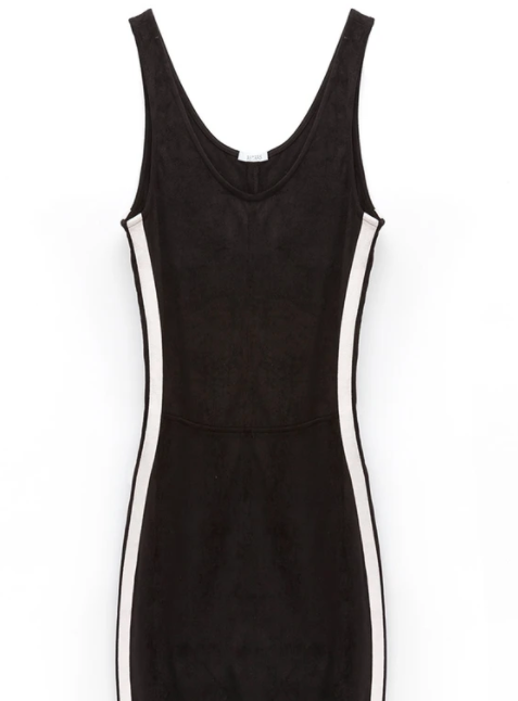 Vegan stretch suede deep scoop neck fitted sexy dress, with vegan suede double stripes applique on sides Cocktail dress length 90% Polyester 10% Spandex Model is 5-10 and is wearing size small. This style runs fitted, please order your normal...