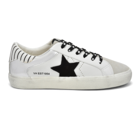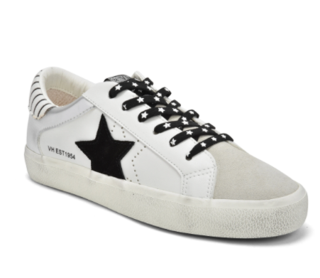Cute and comfortable white sneakers with grey and black textured accents and black and white star laces.