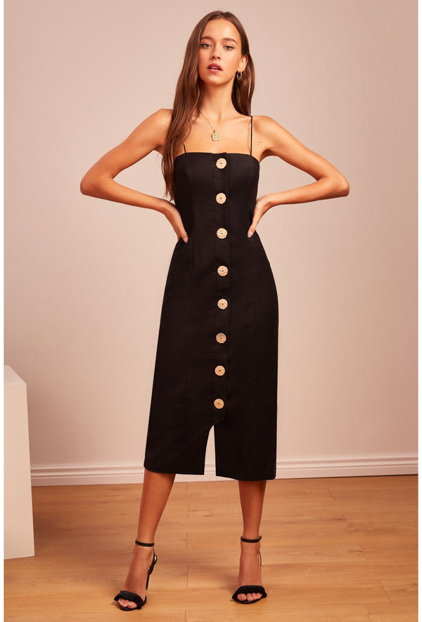 Pompeii Dress-Button down and casual this dress is great for more of a casual dinner or holiday get together. This dress is black and sleeveless. Midi in length.